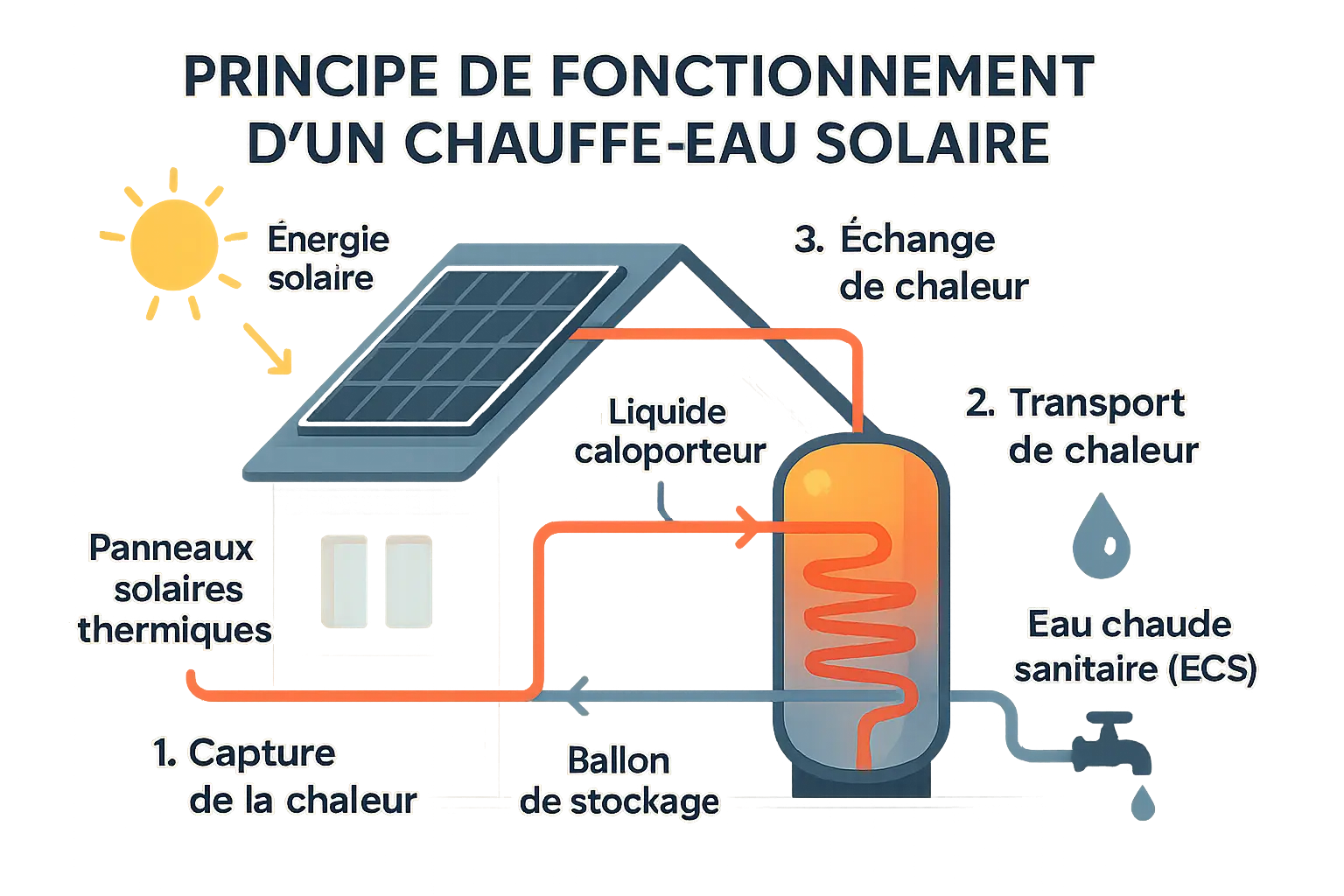 Uno scaldacqua solare utilizza l’energia del sole per riscaldare l’acqua, grazie a pannelli solari termici installati sul tetto o in un’area ben esposta.